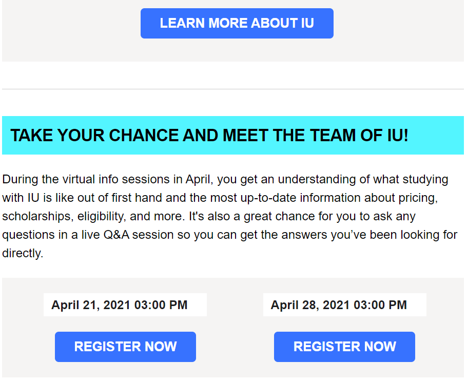 ![]() Take your chance to get to know IU International better and also benefit from their scholarship initiative, where you can save up to 80% on your tuition fees. So, make sure to set a reminder in your calendar and join IU in one of their upcoming info sessions. IU is looking forward to welcome you in the meeting!
