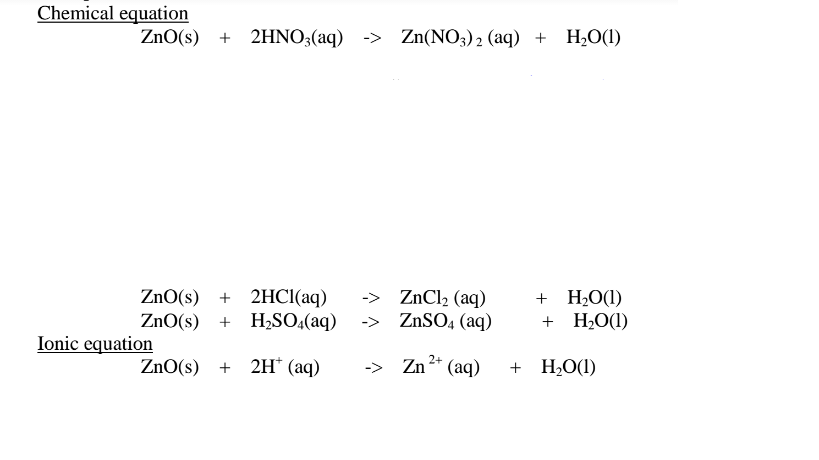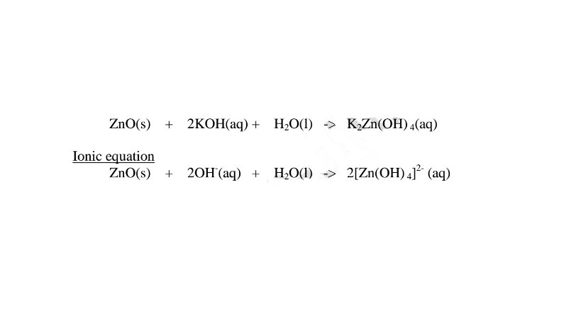 (i)When 1/2 spatula full of Zinc(II)oxide is placed in a boiling tube containing 10cm3 of either 2M nitric(V)acid or 2M sodium hydroxide hydroxide solution, it dissolves on both the acid and the alkali/base to form a colourless solution. i.e.