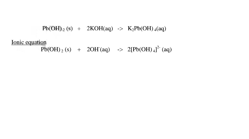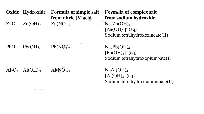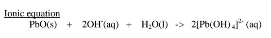 (i)When 1/2 spatula full of Lead(II)oxide is placed in a boiling tube containing 10cm3 of either 2M nitric(V)acid or 2M sodium hydroxide hydroxide solution, it dissolves on both the acid and the alkali/base to form a colourless solution. i.e.