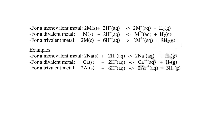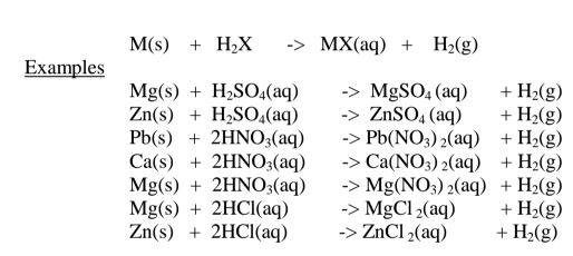 (iv)react with metals to produce /evolve hydrogen gas and a salt. i.e.