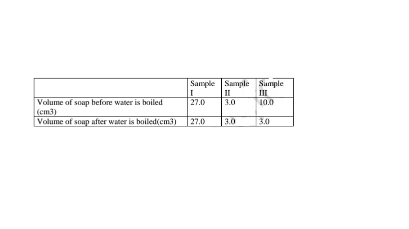 In an experiment, soap solution was added to three separate samples of water. The table below shows the volumes of soap solution required to form lather with 1000cm3 of each sample of water before and after boiling.