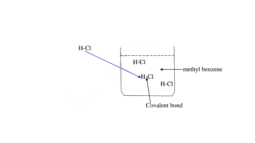 (b)Hydrogen chloride gas dissolves in methylbenzene /benzene but does not dissociate /ionize into free ions.