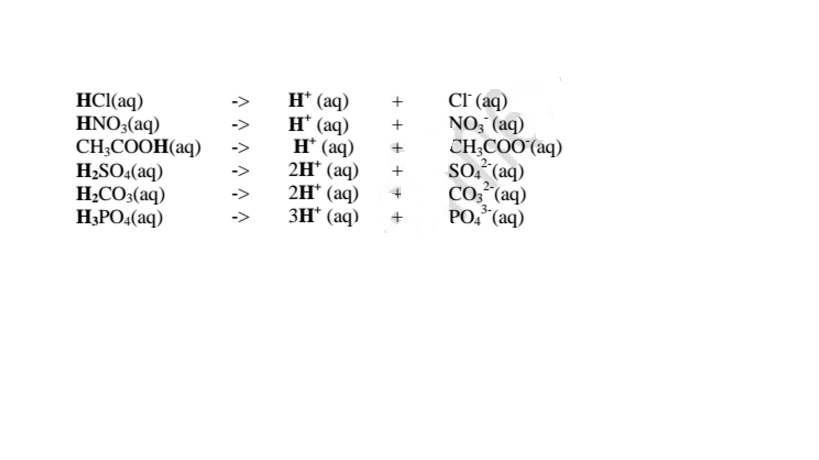 1. An acid is a substance that dissolves in water to form H+/H3O+ as the only positive ion/cation. This is called the Arrhenius definition of an acid. From this definition, an acid dissociate/ionize in water releasing H+ thus: