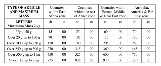 Chebet sent a 150 g letter to her friend in Nigeria, a 1.5 kg letter to her friend in Europe and a 1 kg letter to a friend in America. I-low much did she pay for the postage of the letters?