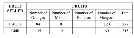 19. The table below shows the number of fruits sold by Fatuma and Bidii on a certain day. The number ofBananas sold by Fatuma and Bidii has not been shown.