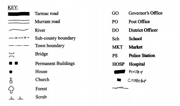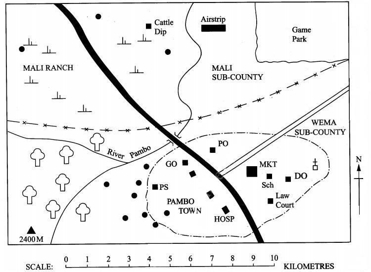 Study the map of Pambo Area provided and answer questions 1-7.