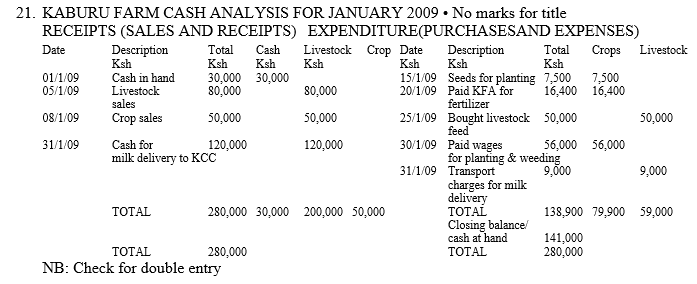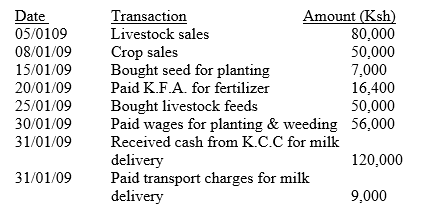 21. On 1st January 2009, Kaburu Farm started farm operations with Ksh 30,000 cash. During the month, the farm made the following transactions. Study the transactions and prepare a cash analysis for Kaburu Farm for the month of January. (51/2 mks)