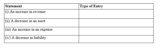 19. Given the statements in the table below, indicate the type of entry to be made in the relevant ledger accounts: (4 marks)