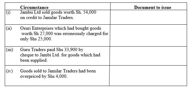 20 In the spaces provided in the table below, name the document Jambi Ltd. would issue under the circumstances described: (4 marks)