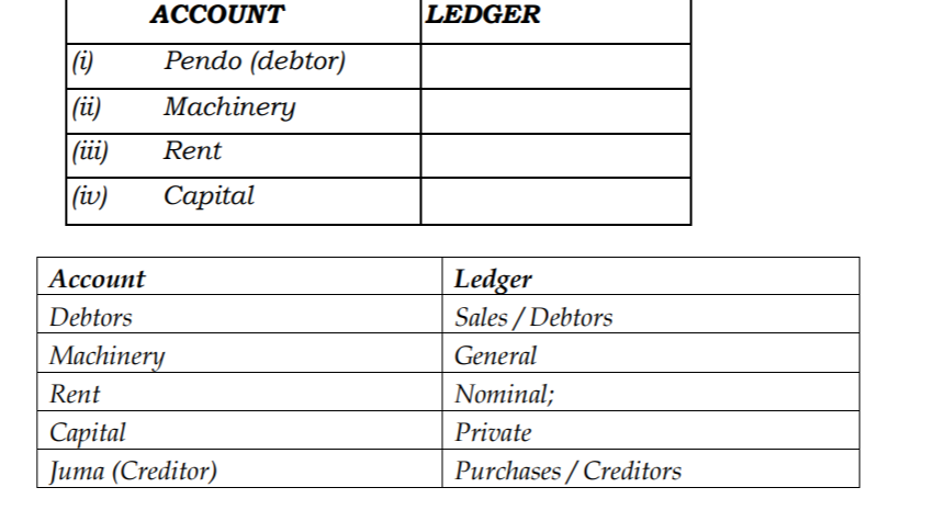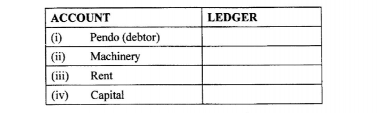 17. Identify the ledgers in which the following accounts are kept. (4 marks)