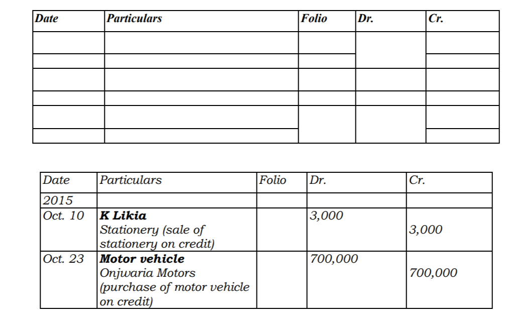 (a) 10"' October 2015 sold unused stationery for Sh 3.000 on credit to K. Likia.