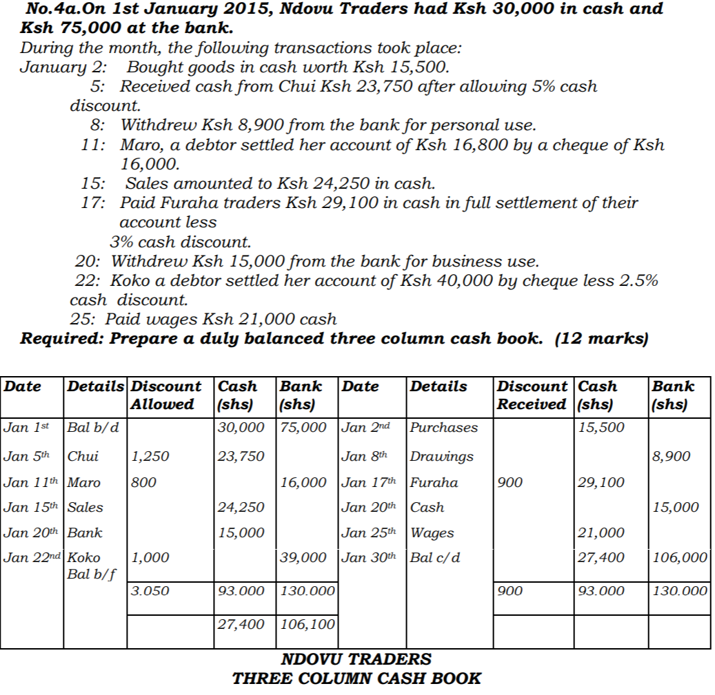 No.4a.On 1st January 2015, Ndovu Traders had Ksh 30,000 in cash and Ksh 75,000 at the bank.