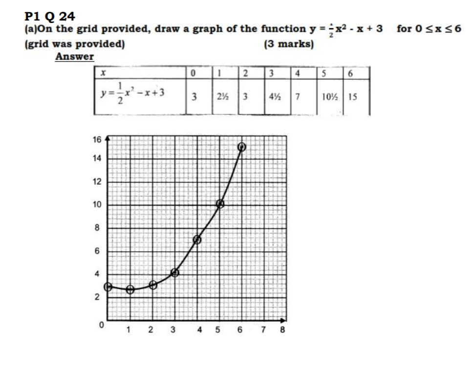 24. (a) On the grid provided, draw a graph of the function y = —2 x2 — x + 3 for 0 < x < 6. (3 marks)