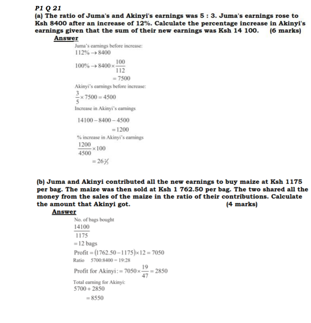 21. (a) The ratio of Juma's and Akinyi's earnings was 5:3. Juma's earnings rose to Ksh 8 400 after an increase of 12%.