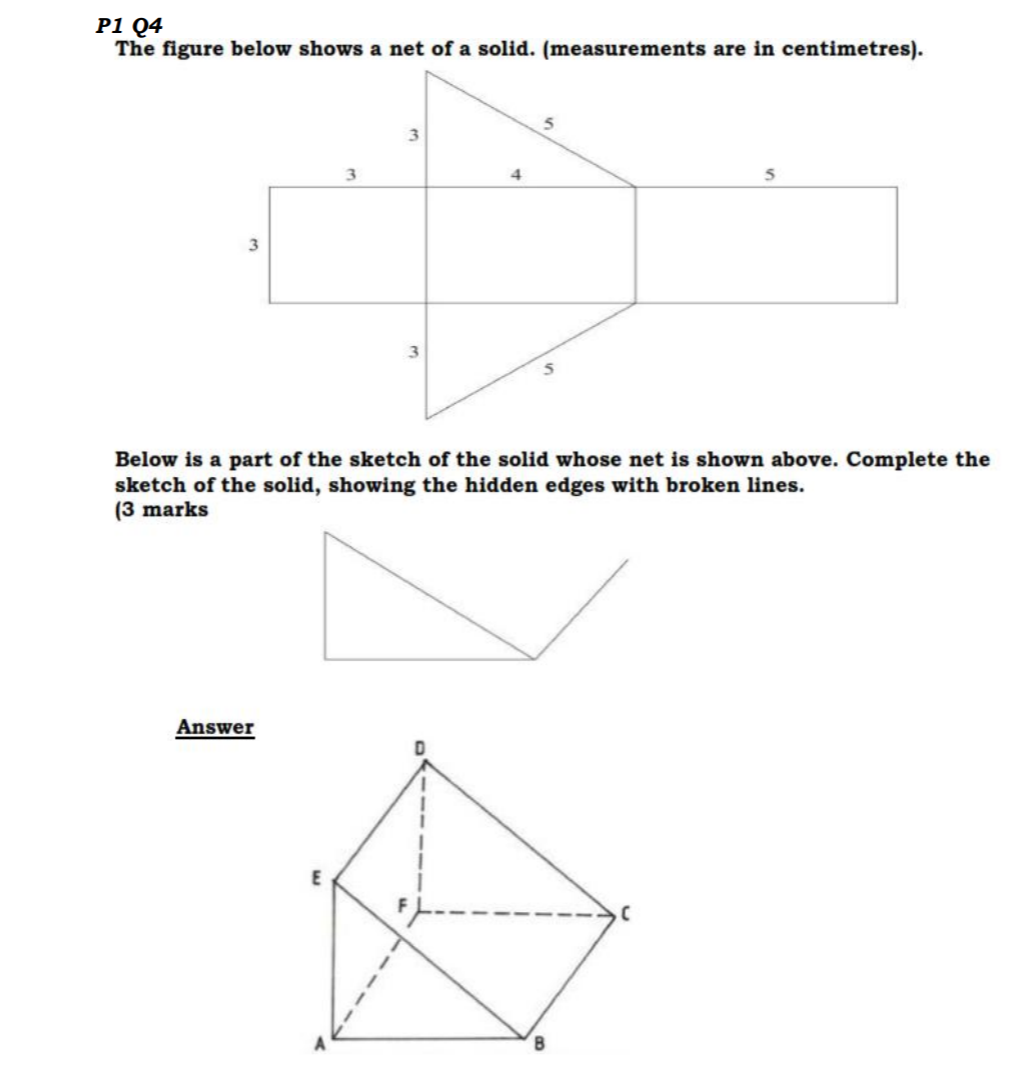 Below is a part of the sketch of the solid whose net is shown above. Complete the sketch of the solid, showing the hidden edges with broken lines. (3 marks)