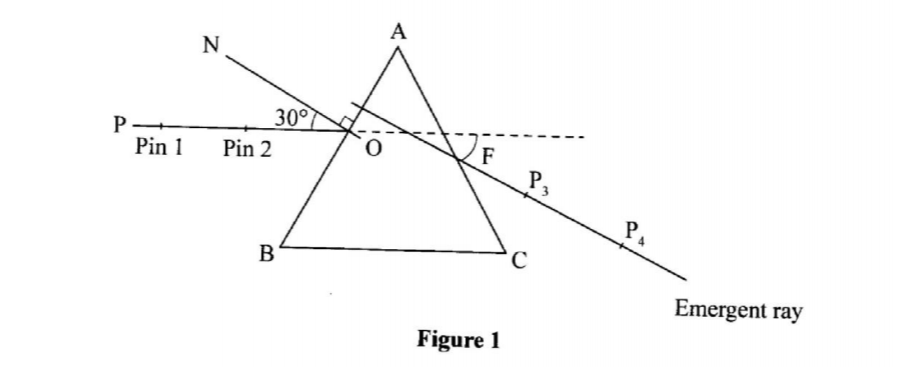 (d) Replace the prism accurately on the outline. Fix two optical pins vertically on line PO at different points (see Figure 1).