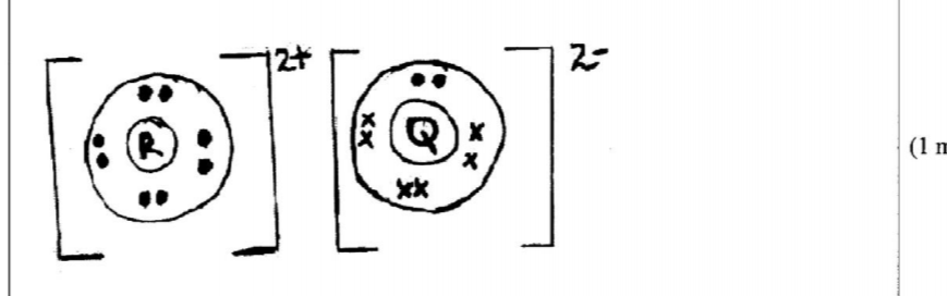 (b) Explain why the melting point of the compound formed by P and S is lower than that formed by R and Q. (1 mark)
