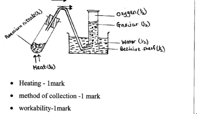 12. Potassium nitrate liberates oxygen gas when heated. Draw a diagram of a set-up that shows heating of potassium nitrate and collection of oxygen gas. (3 marks)