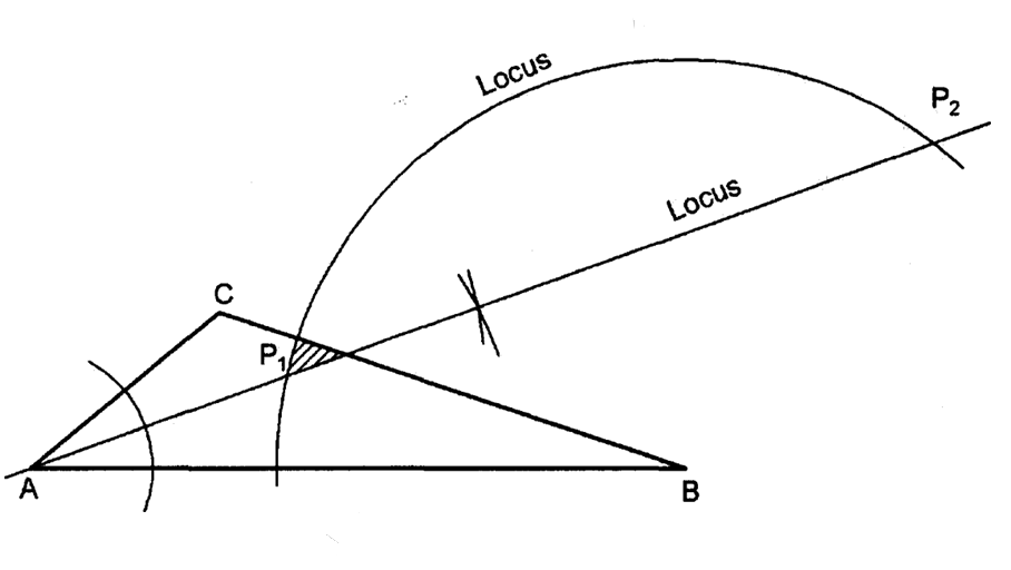 (a) On the triangle, locate the locus of points equidistant from AC and AB and 5 cm from B.