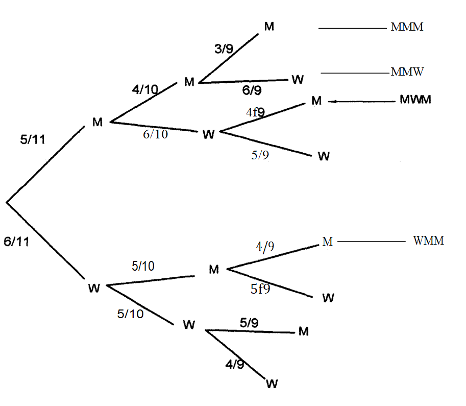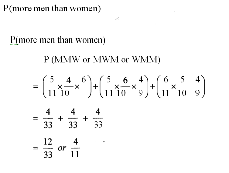 14. A committee of 3 people was chosen at random from a group of 5 men and 6 women. Find the probability that the committee consisted of more men than women. (4 marks)