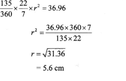 9. The area of a sector of a circle is 36.96 cmz. The sector subtends an angle of 135° at the centre of the circle. Find the radius of the circle. (Take π=22/7). (3 marks)