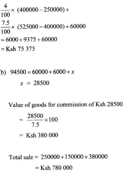 (b) In another month, she earned a total of Ksh 94 500. Find the value of goods that she sold