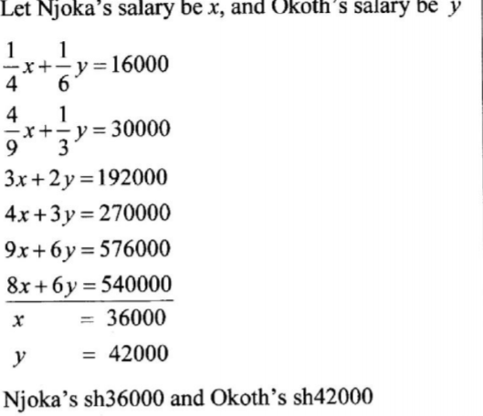 11. Two employees Njoka and Okoth contributed i and % of their salaries respectively to start a project. The contribution amounted to Ksh 16 000. If Njoka contributed 2 and