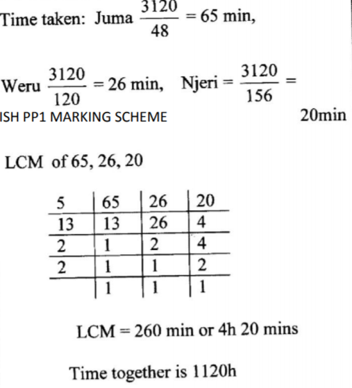 2. Three people Juma, Weru and Njeri went round a circular racing track, 3. 12km long. They all started from the same point and moved in the same direction. Juma walked at 48m per minute,Weru ran at 120m per minute while Njeri cycled at 156m per minute.