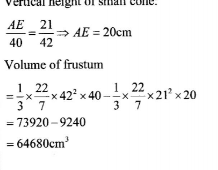 The internal radii of the frustum are 42 cm and 2l cm. The vertical height of the original cone