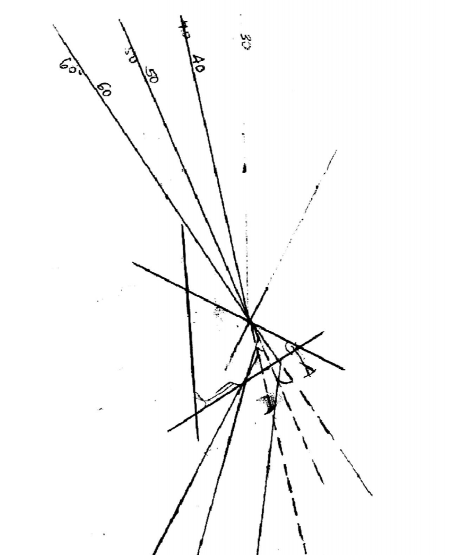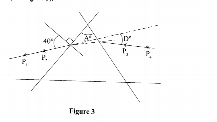 (d) Remove the prism and the pins. Draw a line joining the marks made by P3 and P4. Extend lines P1 P2 and P3 P4 to intersect. Hence measure the angle of deviation D. D = (1 mark)