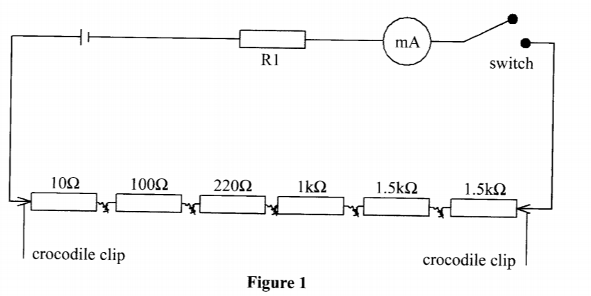 (b) Remove the crocodile clips from the ends of the chain of resistors and connect them across two resistors in the resistance chain that add up to 3.0 kit. Record the reading of the milliammeter 12.