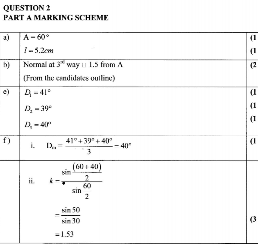 (e) For two other values of angle i shown in Table 2 locate and measure the corresponding angles of deviation. Complete Table 2.
