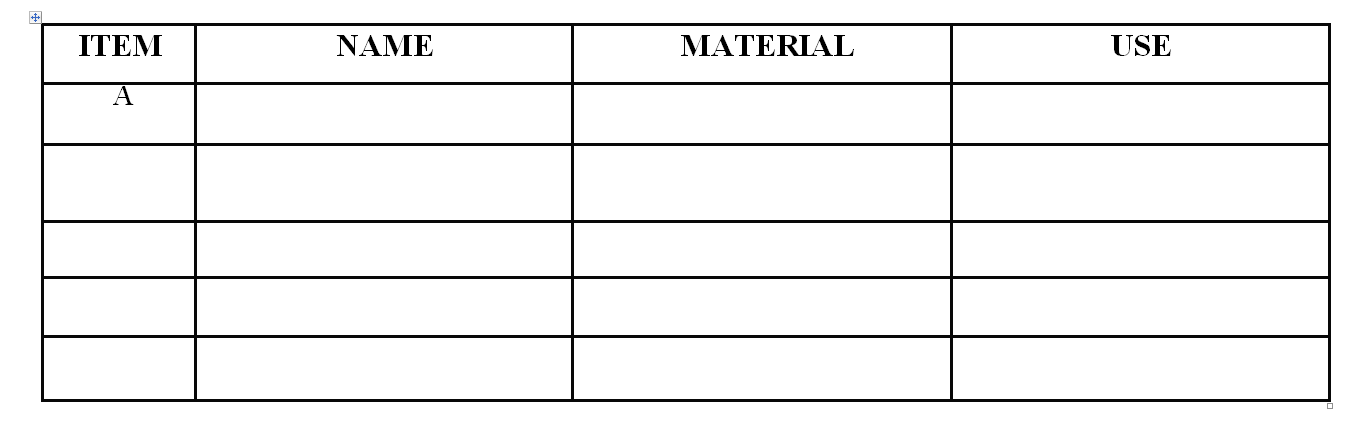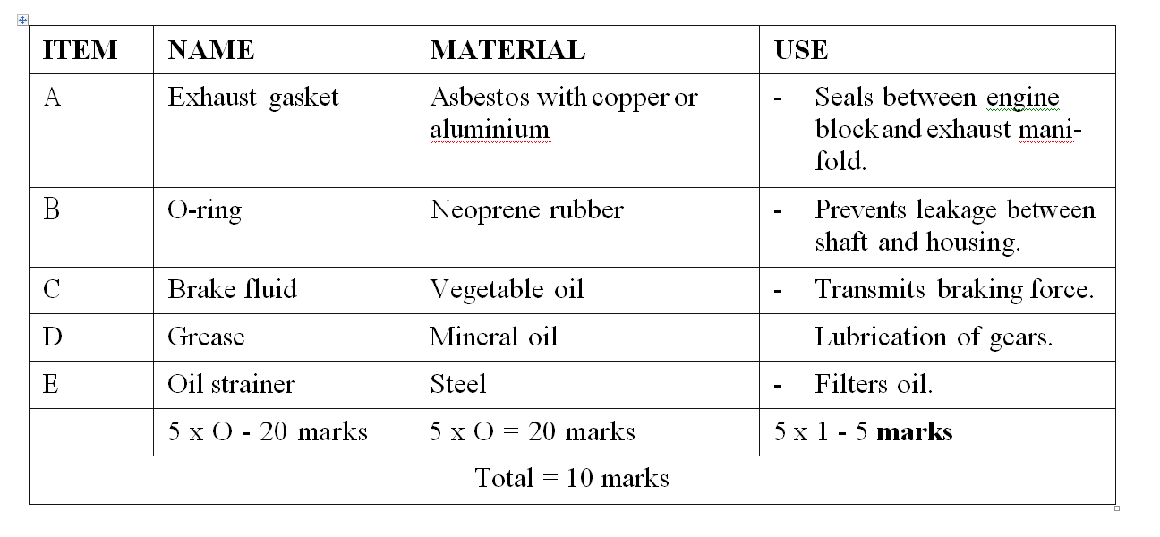 Identify the items labelled A, B, C, D and E. For each item, state the material it is made of and one use in a motor vehicle. Complete the table below. (10 marks)
