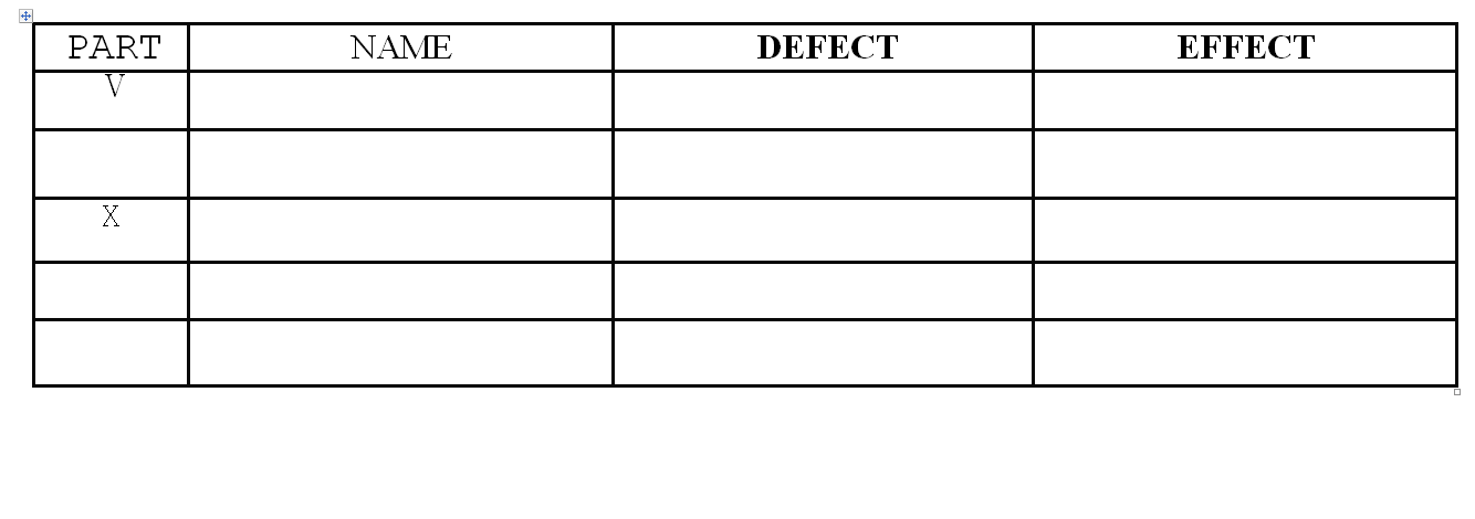 Name the parts labelled V, W, X, Y and Z. For each part, identify one defect and state its effect on vehicle operation. (10 marks)