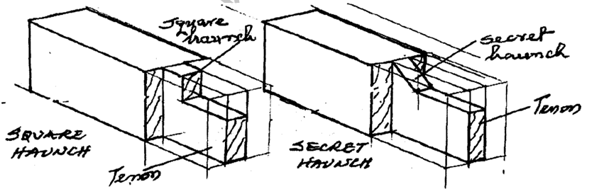 15 (a) Using pictorial sketches, show the difference between square and secret haunch tenon.