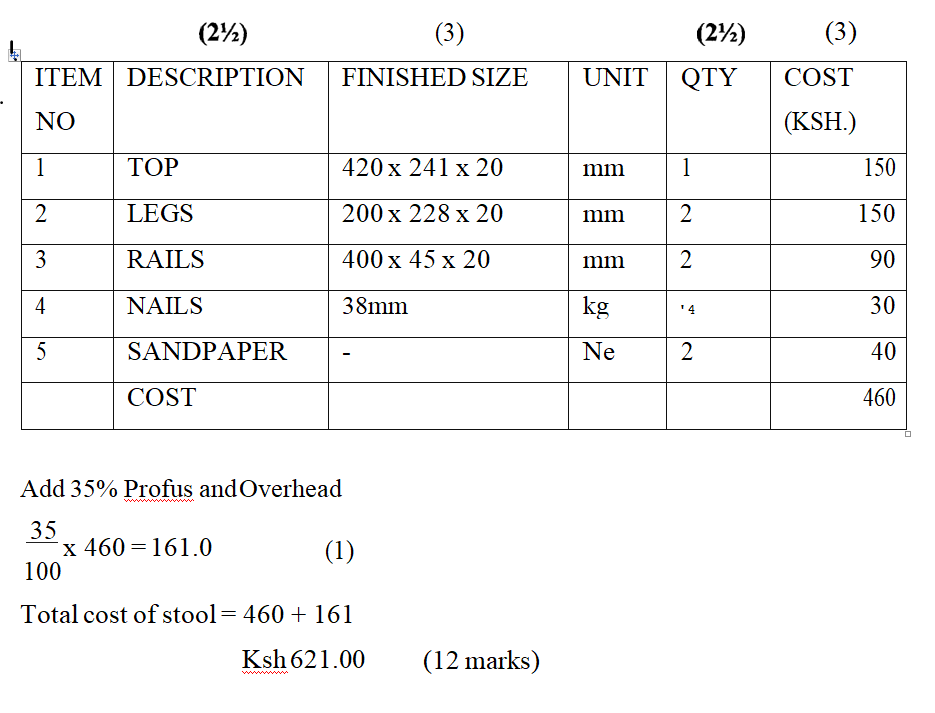 (ii) Calculate the cost of making the stool. (12 marks)