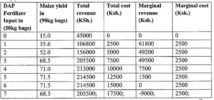 DAP fertiliser costs KSh 2 500 per 50kg bag and the harvested maize is sold at KSh 3 000 per 90kg bag. The quantities of DAP fertiliser applied and maize harvested are as shown in this table below.