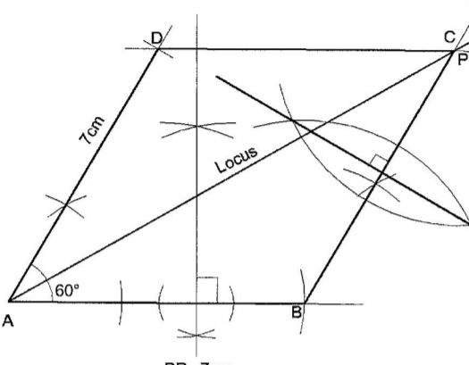 20. (a) Using a ruler and a pair of compasses only, construct: (i) a parallelogram ABCD, with line AB below as part of it, such that AD = 7 cm and angle BAD = 600; (3 marks)