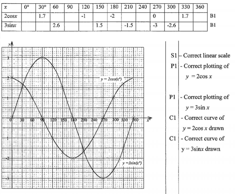 (a) Complete the table for values of y = 2 cos x and y = 3 sin x, correct to 1 decimal place. (2 marks)