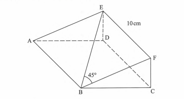4. The figure below represents a wedge ABCDEF. EF 10 cm, angle FBE 45° and the angle between the planes ABFE and ABCD is 20°.