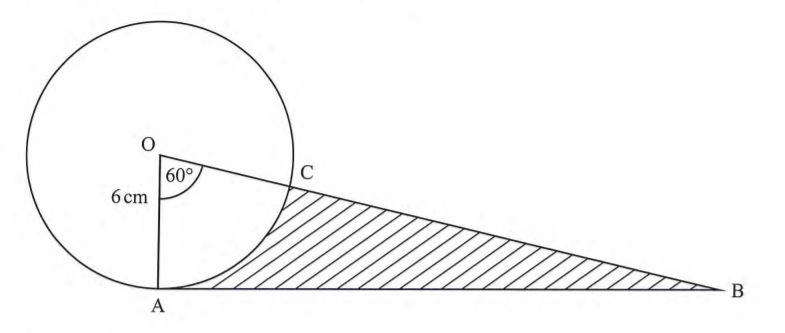 6. In the figure below, AB is a tangent to the circle, centre O and radius 6 cm. The arc AC subtends an angle of 60° at the centre of the circle.