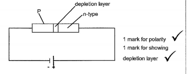 18. (a) (i) Draw a circuit diagram showing the depletion layer of a n junction diode connected in the reverse bias mode. (2 marks)