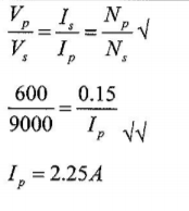 9. A transformer has 600 turns in the primary coil and 9000 tums in the secondary coil. If the transformer is 100% efficient and the current in the secondary coil is 0.15A, determine the current in the primary coil. (3 marks)