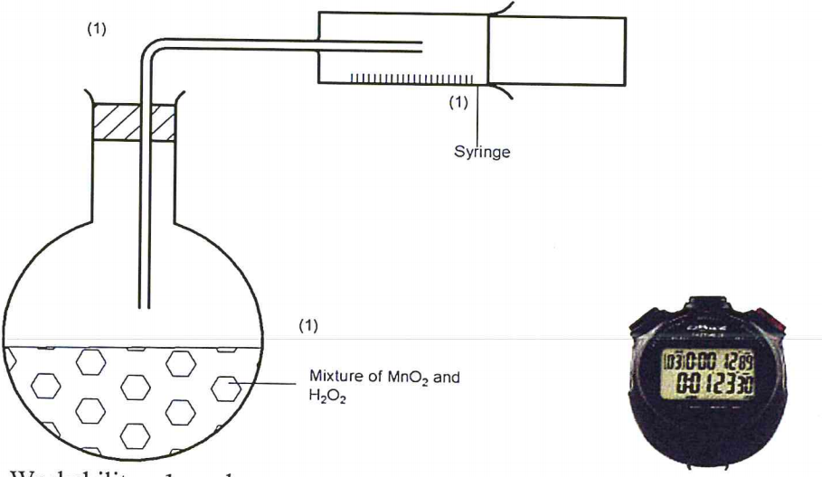 (b) In the space provided, Sketch the diagram of a set-up that Can be used to determine the rate of reaction between manganese(IV) oxide and hydrogen peroxide. (3 marks)