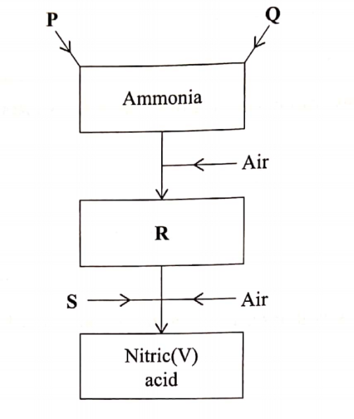 (b) To obtain substance R, ammonia is heated at 900 °C in the presence of air and a catalyst.The product is then cooled in air.