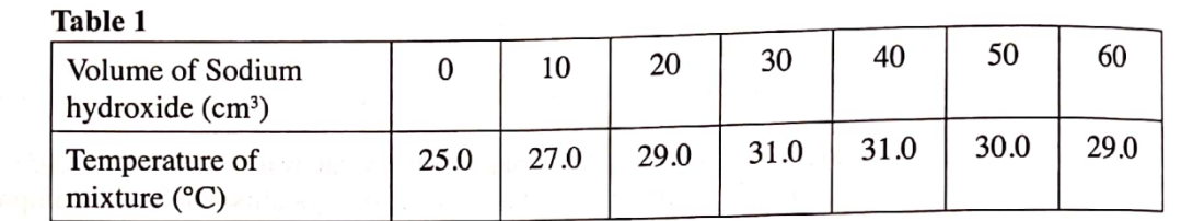 (b) In an experiment to determine the molar heat of neutralisation, 50 cm3 of IM hydrochloric acid was neutralised by adding 10 cm3 Onions Of dilute sodium hydroxide. During the experiment, the data in Table 1 was obtained.