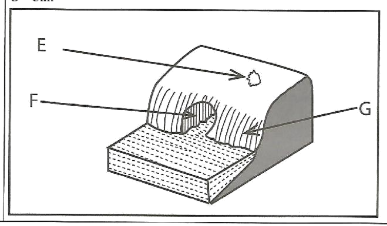 (b) The diagram below shows some coastal features. Name the features marked E, F, and G. (3 marks)