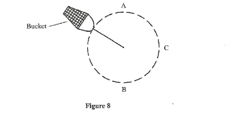 14.(a) Figure 8 shows a bucket filled with water and tied to one end of a string which is used to whirl it in a vertical circular path with a uniform speed v.