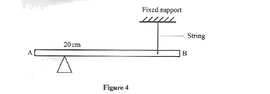 6. Figure 4 shows a uniform rod AB of length 1m and weight 8N pivoted at 20 cm from one end. It is balanced by supporting it with a string attached to a fixed support.