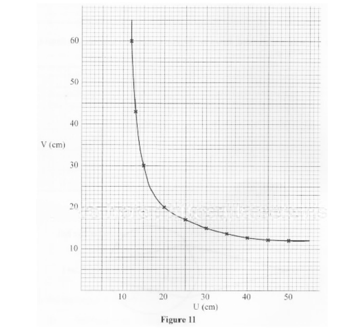 d. Figure 11 shows a graph of image distance (V) against the object distance (U) obtained in an experiment to determine the focal length of a concave mirror.
